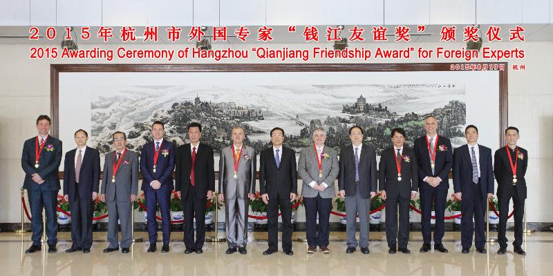 2015年8月19日,杭州市外国专家“钱江友谊奖”颁奖仪式在之江饭店隆重举行。杭州市人民政府市长张鸿铭先生、秘书长王宏先生、人力资源和社会保障局局长郭禾阳先生等领导出席了此次颁奖仪式。