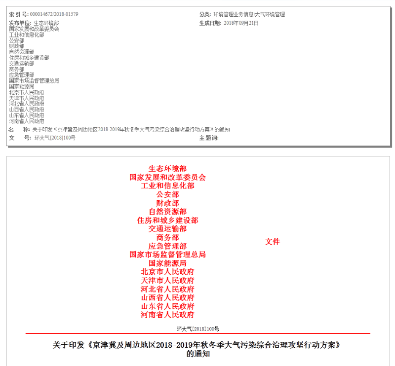 日前,生态环境部、国家发改委、公安部等12部委和6省(市)政府联合发布《京津冀及周边地区2018-2019年秋冬季大气污染综合治理攻坚行动方案》(下称《方案》)。
